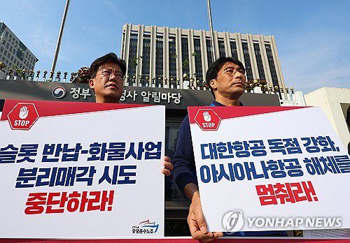 전국공공운수노조와 산하 단체인 아시아나항공 노조(일반노조)는 이날 정부서울청사 앞에서 기자회견을 열어 "대한항공과의 아시아나항공 합병은 국익이나 국민의 편의, 항공산업의 발전을 위한 것이 아니다"라며 "합병의 목표는 결국 아시아나항공 해체"라고 비판했다.