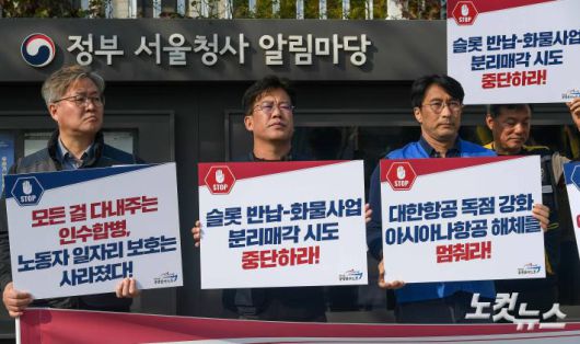 아시아나항공 노조가 24일 정부서울청사 앞에서 대한항공 독점강화, 아시아나항공 해체를 멈춰라! 슬롯 반납-화물사업 분리매각 규탄 기자회견을 하고 있다. 아시아나항공 노조(일반노조)는 이날 "대한항공과의 아시아나항공 합병은 국익이나 국민의 편의, 항공산업의 발전을 위한 것이 아니다"라며 "합병의 목표는 결국 아시아나항공 해체"라고 비판했다.