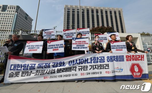 (서울=뉴스1) 박지혜 기자 = 민주노총 공공운수노조 및 아시아나항공 노조 관계자들이 24일 서울 종로구 정부서울청사 앞 에서 열린 대한항공의 아시아나 슬롯 반납 및 화물사업 분리매각 추진 규탄 기자회견에서 아시아나항공 해체 중단을 촉구하고 있다. 이날 전국공공운수노조와 산하 단체인 아시아나항공 노조는 "대한항공과의 아시아나항공 합병은 국익이나 국민의 편의, 항공산업의 발전을 위한 것이 아니다"라며 "합병의 목표는 결국 아시아나항공 해체"라고 비판했다. 2023.10.24/뉴스1