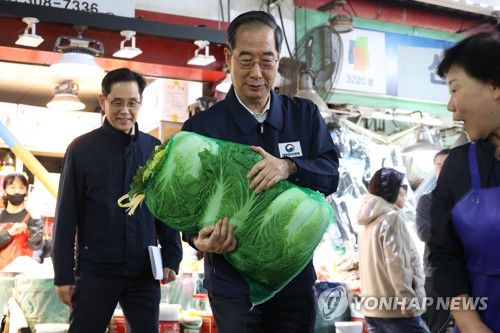 (서울=연합뉴스) 김영신 기자 = 한덕수 국무총리가 24일 서울 마포구 마포 농수산물 시장을 찾아 배추 등의 물가를 점검하고 현장 민심을 살폈다.
