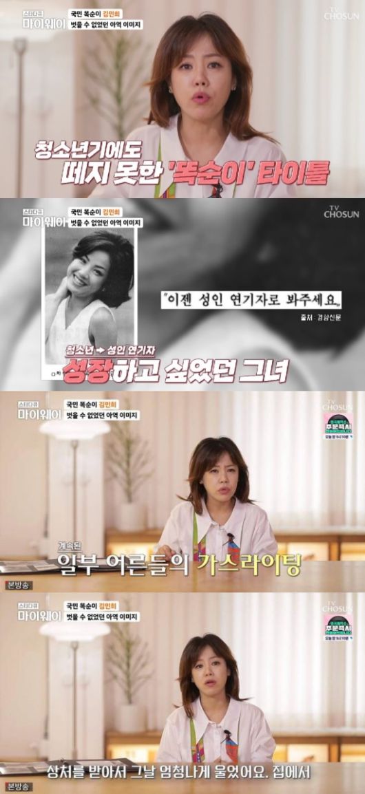 김민희는 "저만 보면 '똑순이'라고 하는데, 그게 너무 싫더라. 그리고 그 때가 한창 야한 영화가 유행할 때였다. 주위에서 사람들이 '너는 (아역) 이미지가 강해서 안 된다'고, '벗어야 한다'고 그랬었다. 여자로 보이지 않으면 끝나는 것이라는 말에 상처를 받고 집에서 엄청 울기도 했다"며 당시 일부 어른들에게 겪었던 가스라이팅 경험을 고백했다.