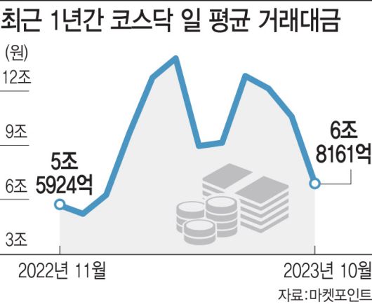 24일 마켓포인트에 따르면 이달 일 평균 코스닥 거래대금은 6조8161억원을 기록하며 4개월 연속 감소세를 이어가고 있다. 지난 9월(10조5573억원)보다 35.4% 줄어든 수준이다.