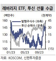 최 연구원은 “최근 투신권의 선물 매수 유입과 동시 레버리지 ETF의 발행 주식수도 늘어나고 있다”며 “조정 구간을 거쳐 가격 메리트가 나타나면서 레버리지 ETF를 찾는 수요가 증가한 것으로 추정한다”고 전했다.