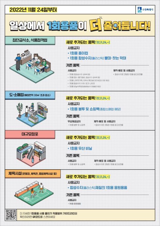 계도기간 이후에는 위반사항 적발 시 과태료가 부과되며, 업종별 규제품목 및 준수사항 등은 수원시 홈페이지 시정소식에서 확인할 수 있다.