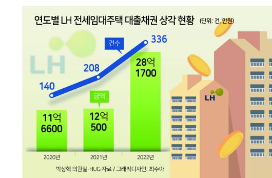 25일 국회 국토교통위원회 소속 박상혁 더불어민주당 의원이 주택도시기금 수탁기관인 주택도시보증공사(HUG)로부터 제출받은 ‘연도별 LH 전세임대주택 대출채권 상각 현황’ 자료에 따르면 지난해 상각승인된 LH 전세임대주택 대출액은 28억1700만원이다. 2021년 상각액이 12억500만원이었던 것과 비교하면 1년 새 16억원 넘게 증가했다. 2020년에는 11억6600만원을 기록해 매년 액수가 늘어나는 추세다. 상각승인건수 또한 2020년 140건→2021년 208건→2022년 336건으로 지속적인 증가세를 보이고 있다.