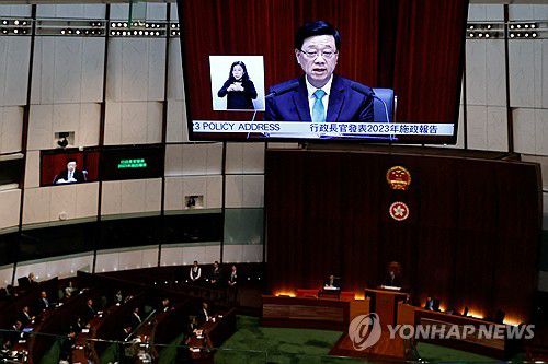 (로이터=연합뉴스) 존 리 홍콩 행정장관이 25일 입법회에서 시정연설을 하고 있다. 2023.10.25. |