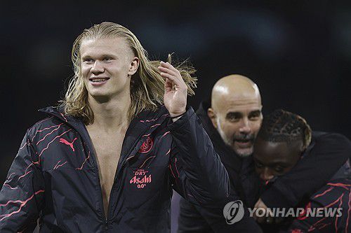 페프 과르디올라 감독 앞에서 금발 머리를 휘날리며 승리를 기뻐하는 엘링 홀란 |