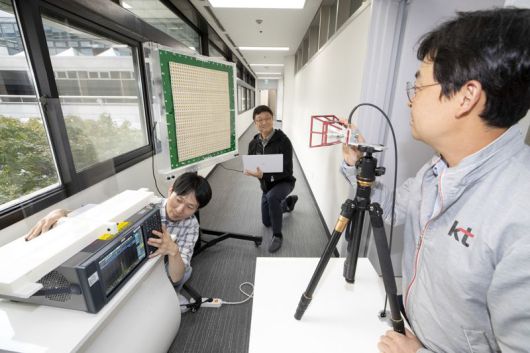 서울 서초구 KT 연구개발센터에서 KT와 LG전자 연구원이 6G 주파수 후보 대역별로 RIS(재구성 가능한 지능형 표면)의 성능을 공동 검증하고 있다. KT 제공 |