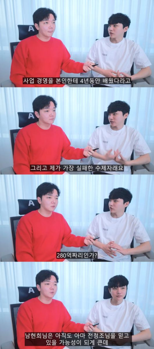 전씨는 로알남에게 "남현희에게 청담동에 있는 280억 집을 사줬다", "경호원도 월세 3천만원을 대신 내주고 시그니엘에 살고 있게 하고 있다" 등의 주장을 펼쳤다고 한다. 로알남은 "51조 자산가이니까 가능할 것"이라며 웃음을 보였다.