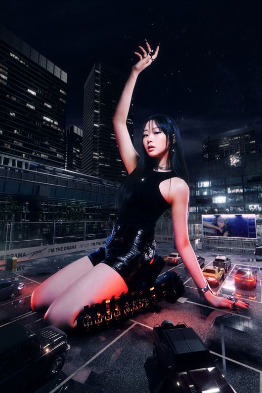 해당 사진 속 지젤은 검은 색채의 의상으로 몽환적인 매력을 선보이고 있다. 이에 더해 밤이 찾아온 도시 한가운데 거인이 돼 앉아있는 지젤의 모습도 눈길을 끌었다.