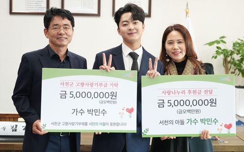 (서천=연합뉴스) 정윤덕 기자 = 충남 서천군은 트로트 가수 박민수 씨가 고향인 서천에 고향사랑기부금 등 1천만원을 기부했다고 26일 밝혔다.