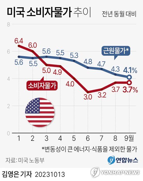 미국 소비자물가지수(CPI) 상승률은 지난해 6월 9.1%로 41년 만에 최고치를 찍은 뒤 지난달 3.7%까지 내려갔다.