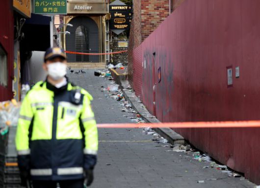 경찰이 서울 용산구 이태원 압사 참사 현장을 통제하며 지키고 있다. /사진=뉴스1 |
