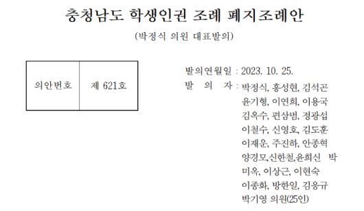 26일 충남도의회에 따르면 박정식(아산3) 의원 등 국민의힘 도의원 25명은 전날 학생인권조례 폐지안을 발의했다.
