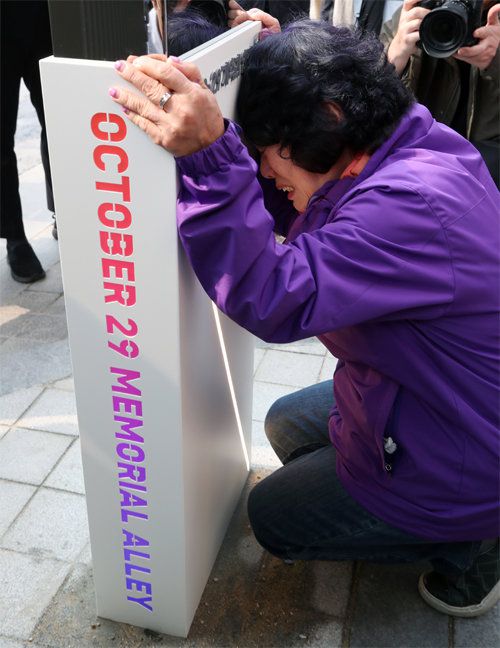 이태원 핼러윈 참사 희생자 고 정주희 씨의 어머니 이효숙 씨가 26일 서울 용산구 이태원역 1번 출구 앞에서 거리에 설치된 추모 조형물을 붙잡고 눈물을 흘리고 있다. 이날 이곳에선 ‘10·29 기억과 안전의 길’ 조성을 알리는 기자회견이 열렸다. 뉴스1 ⓒ 동아일보 & donga.com, 무단 전재 및 재배포 금지