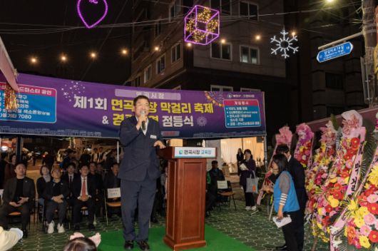 지난 26일 서울 광진구 면곡골목시장에서 열린 ‘면곡이랑 한잔해’ 축제에서 김경호 광진구청장이 인사말을 하고 있다. 광진구 제공 |
