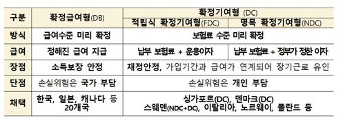 국민연금은 현재는 급여 수준을 미리 정해놓고 확정된 급여를 지급하는 확정급여방식(DB)인데, 정부는 이를 보험료 수준을 미리 확정해 놓고 납부한 보험료에 이자를 더한 금액을 급여로 받는 확정기여방식으로 전환을 논의하자고 제안했다.