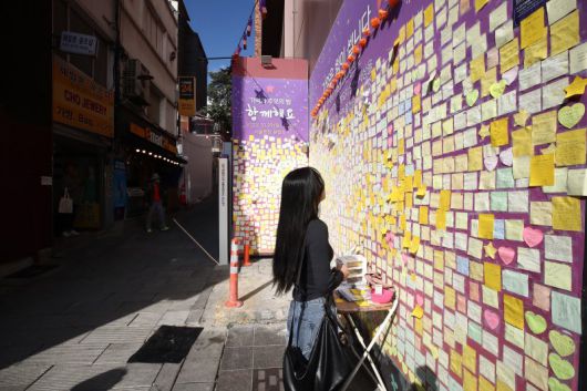 (서울=뉴스1) 박세연 기자 = 10.29 이태원 참사 1주기를 앞둔 27일 한 시민이 서울 용산구 이태원역 1번 출구 앞 골목 초입 마련된 추모공간의 추모의 글을 살펴보고 있다. 정부는 핼러윈 기간 인파 밀집 위험도가 높을 것으로 예상되는 서울 이태원과 홍대, 명동, 대구 동성로 등 4곳을 집중적으로 관리하기로 했다. 2023.10.27/뉴스1 /사진=뉴스1화상 |
