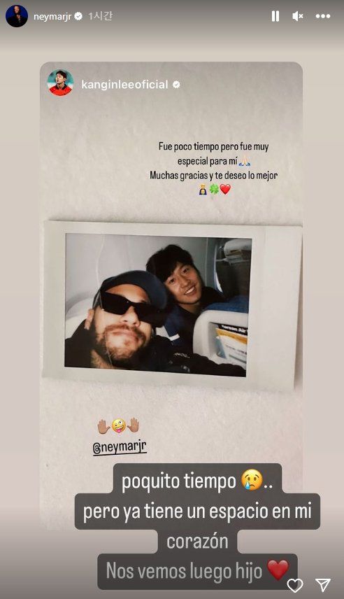 네이마르와 파리 생제르맹 작별이 확정되고 이강인이 작별 인사를 건넸다. 이강인은 자신의 사회관계망서비스(SNS)를 통해 "짧은 시간이었지만 나에게는 정말 특별했다. 정말 감사했다. 항상 좋은 일만 가득했으면 좋겠다"라며 프리시즌 기간 네이마르와 함께 찍었던 사진을 게재했다.