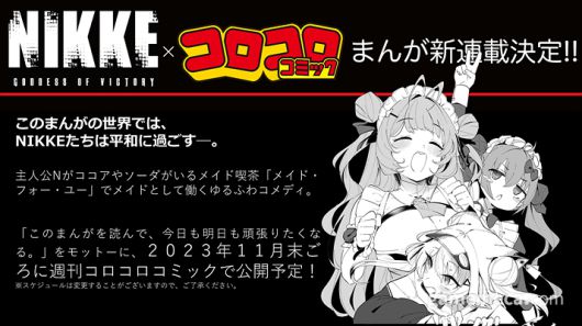 니케 만화는 일본의 웹 만화 사이트 주간 코로코로 코믹에서 연재되며, 오는 11월 말부터 연재를 시작한다. 주간 코로코로 코믹은 소학관의 만화 연재 플랫폼으로, 게임 기반 만화가 다수 연재됐다.