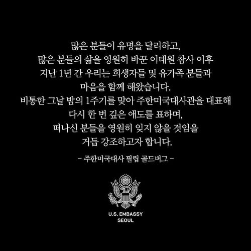 주한미국대사관이 이태원 참사 1주년을 맞아 “희생자 및 유가족과 마음을 함께 해 왔다”며 “떠난 사람들을 영원히 잊지 않겠다”며 애도를 표했다.