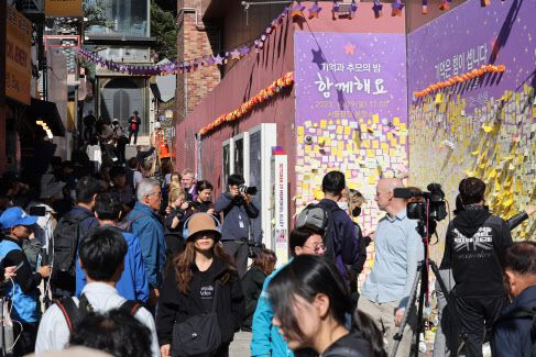 10·29 이태원 참사 1주기를 맞은 29일 오후 서울 용산구 이태원 참사 현장에 마련된 ‘10·29 기억과 안전의 길’의 추모 공간‘을 찾은 시민들이 추모하고 있다.(사진=연합뉴스) |