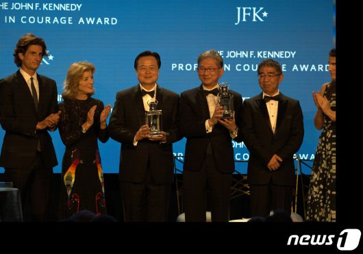 (서울=뉴스1) 오대일 기자 = 윤석열 대통령은 29일 저녁(현지시간) 미국 존 F. 케네디 재단이 수여하는 '2023년 용기 있는 사람들 상(Profile in Courage Award)'을 기시다 후미오 일본 총리와 공동 수상했다. 사진은 보스턴 JFK 재단 도서관 겸 박물관에서 개최된 시상식에서 조현동 주미대사(왼쪽 세번째)가 대리 참석한 시상식 모습. (대통령실 제공) 2023.10.30/뉴스1