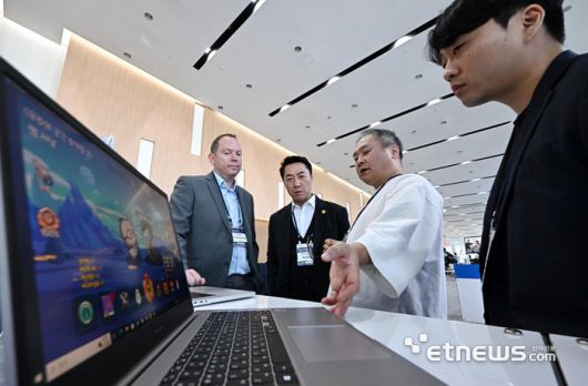 2023 글로벌 블록체인 인천 컨퍼런스가 인천광역시 주최, 인천테크노파크 주관으로 30일 인천 연수구 송도컨벤시아에서 열렸다. 참관객이 아이피샵의 블록체인 게임 '오당탕탕 스매시'를 살펴보고 있다. 인천=이동근기자 foto@etnews.com [Copyright © 전자신문. 무단전재-재배포금지]