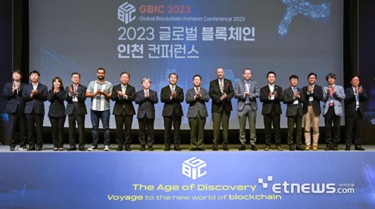 2023 글로벌 블록체인 인천 컨퍼런스가 인천광역시 주최, 인천테크노파크 주관으로 30일 인천 연수구 송도컨벤시아에서 열렸다. 내빈들이 기념촬영하고 있다. 왼쪽부터 이진형 인천테크노파크(TP) 센터장, 김근식 인천TP SW산업진흥단장, 손혜영 인천광역시 데이터산업과장, 이주호 인천TP 원장, 마룬 젤레그 폴리곤 아시아퍼시픽 지부장, 패트릭 윤 크립토닷컴코리아 대표, 이남주 인천시 미래산업국장, 정해권 인천광역시의회 산업경제위원장, 박덕수 인천시 행정부시장, 라티프 라디드 5G 월드 얼라이언스 회장, 제임스 벨딩 토크나이즈드 CEO, 아론 킴 B2Block pty ltd 대표, 김성곤 한국블록체인산업협회 이사, 박수용 Web3.0 포럼 운영위원장, 정유신 디지털경제금융연구원장, 이근주 한국핀테크산업협회장.
