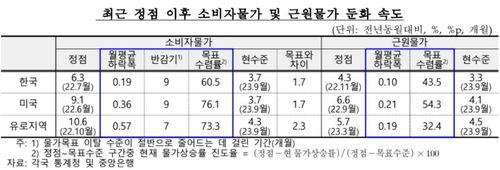 같은 기간 물가 목표(2%)까지의 물가 상승 둔화 진도율도 미국과 유럽 지역(각 75% 내외)에 비해 한국이 61%로 낮은 수준에 머무르고 있다.
