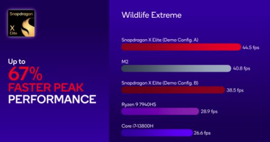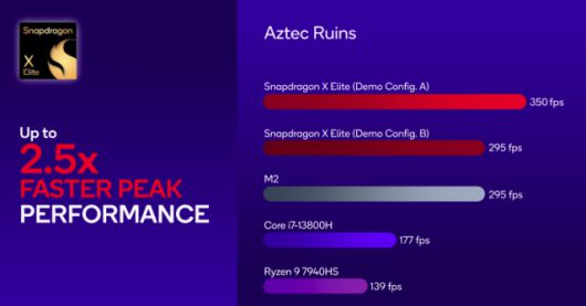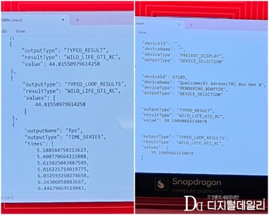 벤치마크에 앞서 퀄컴은 측정된 레퍼런스 노트북을 제시했다. 퀄컴이 제시한 레퍼런스 노트북은 총 2대다. 두 종 모두 동일한 규격의 ‘스냅드래곤X 엘리트’ 플랫폼이 탑재됐다. A모델은 TDP 최대 80W, 16.8mm 두께, 3840x2160 QHD 해상도의 15.6인치 TFT-LCD 디스플레이, 87Wh 전력효율을 갖췄다. B모델은 TDP 23W, 두께 15mm, 2880x1800 해상도의 14.5인치 OLED 디스플레이, 58Wh 전력효율을 보유하고 있다.