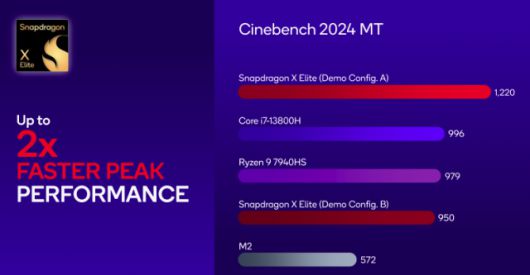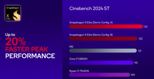 시네벤치(2024) 싱글스레드 벤치마크 결과도 경쟁사 대비 20% 더 빠른 피크 속도를 보였다. 멀티스레드는 특히 2배 더 빠른 피크 성능을 보였다. A모델은 애플 M2 대비 2배 이상 차이를 발생시키기도 했다.