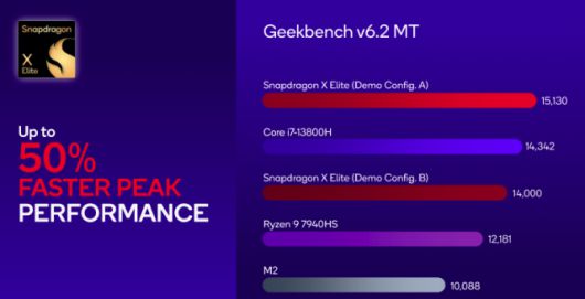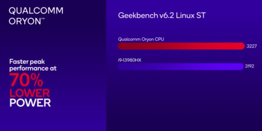 긱벤치(V6.2) 리눅스 싱글스레드 벤치마크 결과 퀄컴 오라이온 CPU는 3227점을 기록한데 비해 인텔 i9-13980HX는 3192점이 도출됐다. 퀄컴은 피크 성능에서 70% 전력을 아낄 수 있었다고 설명했다. 긱벤치 싱글스레드 점수에서도 퀄컴의 A와 B모델이 나란히 1, 2위를 차지했다. 10% 더 높은 피크 성능을 보여줬다. 긱벤치 멀티스레드 점수에서는 퀄컴이 경쟁사 대비 50% 더 빠른 피크 성능을 나타냈다.
