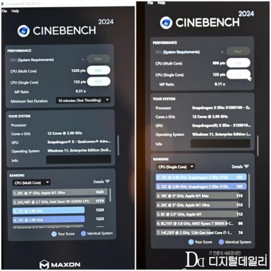 우선 시네벤치 결과다. A모델의 경우 싱글코어는 132점, 멀티코어는 1226점을 기록했다. B모델의 경우 싱글코어 123점, 멀티코어는 996점이다. 긱벤치의 경우 A모델은 싱글코어 2978점, 멀티코어는 1만5123점을, B모델의 경우 싱글코어는 2780점, 멀티코어는 1만3965점을 나타냈다.