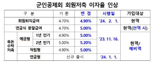 아시아투데이 이석종 국방전문기자 = 군인공제회(이사장 정재관)는 다음달 16일부터 예금형 목돈수탁저축 이자율을 1년 만기는 4.90%에서 5.00%로, 2년 만기는 5.00%에서 5.20%로 각각 인상한다고 31일 밝혔다. 적립형은 4.90%에서 5.00%로 올린다.