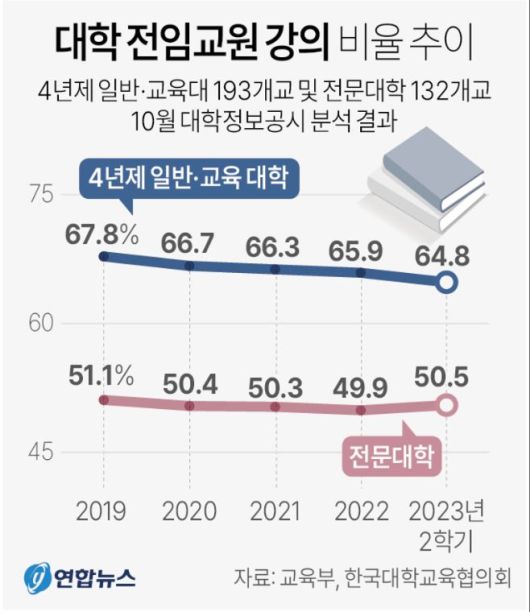 31일 교육부와 한국대학교육협의회가 발표한 2023년 10월 대학정보공시 분석 결과를 보면, 올해 2학기 4년제 일반·교육대학 193개교에서 전임교원의 강의 담당 비율은 64.8%로, 전년 대비 1.1%포인트 하락했다. 2019년(67.8%) 이후 4년 연속 떨어졌다. 대학의 교원은 정교수·부교수·조교수 등 교수를 전업으로 하는 전임교원과 강사·겸임교원·초빙교원 등 비전임교원으로 구성된다.