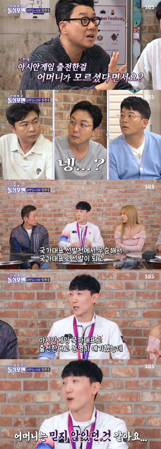 김관우는 "아시안게임 나갔을 때 엄마가 몰랐다. 국가대표로 나간다고 분명히 얘기했는데 엄마는 믿지 않았던 것 같다. 경기 종목이란 걸 어른들은 상상 못하실 것"이라는 일화를 공개했다.