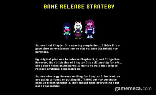 언더테일 개발자로 유명한 토비 폭스가 ‘델타룬(Deltarune)’ 챕터 3 개발이 완료됐으며, 챕터 4가 완성되는 대로 게임을 발매하겠다고 밝혔다.