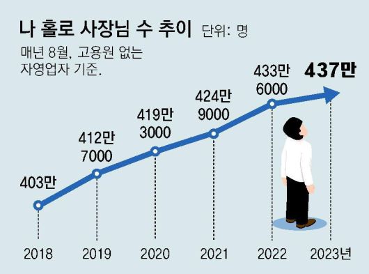 1일 통계청이 발표한 ‘비임금근로 및 비경제활동인구 부가조사’에 따르면 올 8월 고용원 없는 자영업자 수는 437만 명으로 집계됐다. 1년 전보다 3만4000명(0.8%) 늘어난 규모로, 2008년 이후 가장 많다. 고용원 없는 자영업자는 혼자 일하거나 임금을 받지 않는 가족(무급 가족 종사자)과 함께 사업체를 운영하는 이를 말한다.