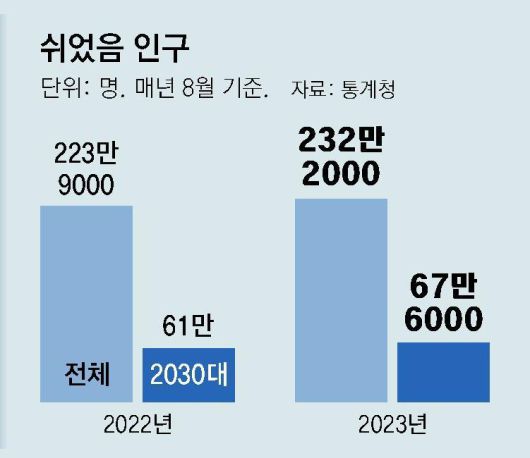통계청 관계자는 “20, 30대는 일자리가 없다는 등의 이유로 쉬는 경우가 많았고, 고령층일수록 몸이 좋지 않거나 이전에 하던 일을 마치고 다음 일을 준비하는 과정에서 쉬는 것으로 나타났다”고 말했다.