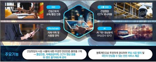 이 서비스는 조작이 불가능한 블록체인 기술을 기반으로, 증명된 현장인력 출입관리, 인증된 자재 이력관리, 폐쇄회로(CC)TV, 사물인터넷(IoT)센싱, 인공지능(AI) 등 통합관제 기술을 아파트 건설 현장에 적용해 투명한 공사관리가 이뤄지게 하는 서비스다. 최근 사회적으로 문제가 된 무량판 구조 아파트 철근 누락이나 건축자재 시험성적서 위·변조 등으로 인한 부실시공 문제 해결을 위해 착안했다.