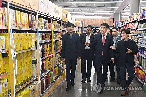 ▲ 산업통상자원부 장영진 1차관은 2일 대전 홈플러스에서 서민 물가를 점검하고 업계의 애로 사항을 듣는 간담회를 열었다. 장 차관은 '산업부 기동대'(기업동향 대책반) 1호로 유통 현장을 찾았다. 이날 장 차관은 식품 판매대에서 최근 가격 인상이 우려되는 배추와 무 등 김장 재료와 함께 커피믹스, 라면 등의 가격 동향을 파악했다. 이어 홈플러스 및 한국체인스토어협회 관계자들이 참여하는 간담회를 열고 유통업계 애로 사항을 청취한 뒤 정부 지원 방안 등을 논의했다. (서울=연합뉴스)
