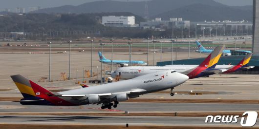 (인천공항=뉴스1) 김성진 기자 = 아시아나항공의 화물사업 매각안이 가결된 2일 인천국제공항 전망대에서 바라본 계류장에 아시아나항공 항공기가 이륙하고 있다. 아시아나항공은 이날 이사회에서 유럽연합 집행위원회(EC)에 제출할 대한항공의 시정조치안에 대해 동의하는 안건을 표결 끝에 가결했다. 이 시정조치안에는 독과점 우려를 해소하기 위해 아시아나 화물사업을 분리 매각하는 방안이 포함돼 있다. 2023.11.2/뉴스1
