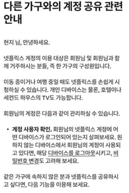넷플릭스가 국내에서도 계정 공유 제한 정책을 시행합니다. 한집에 같이 살지 않지만 계정을 함께 사용할 경우, 매월 5000원을 추가로 내야 합니다. 넷플릭스는 2일 자사 홈페이지를 통해 "오늘부터 넷플릭스 국내 회원들에게 새로운 계정 공유 기능 안내 메일 발송을 시작한다"며 "넷플릭스 계정의 이용 대상은 한 가구의 구성원으로, 같은 가구 내 거주하는 분들은 어디서든 넷플릭스를 자유롭게 이용할 수 있다"고 공지했습니다.