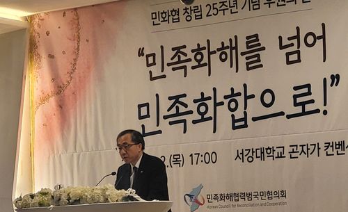 김 장관은 이날 오후 마포구 서강대 곤자가컨벤션에서 열린 민족화해협력범국민협의회(민화협) 창립 25주년 기념 후원의 날 행사에서 문승현 차관이 대독한 축사를 통해 윤석열 정부의 '원칙 있는' 남북관계 기조를 거듭 강조했다.