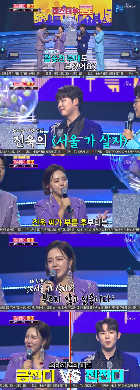 또한 금잔디와 진욱은 '서울 가 살자'를 함께 부르며 스페셜 듀엣 무대를 꾸몄다. 이어 '미스터로또'의 톰과 제리 진해성과 박서진은 나진기의 '내가 있잖아'를 부르며 화합의 무대를 완성했다.