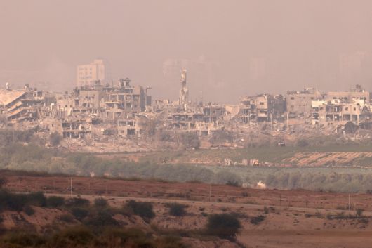 2일(현지시간) 이스라엘 접경지에서 바라본 팔레스타인 가자지구 모습. 이스라엘군이 지난달 27일 가자지구에 진입한 뒤 가자지구는 곳곳이 폐허로 변하고 있다. 연합뉴스 |