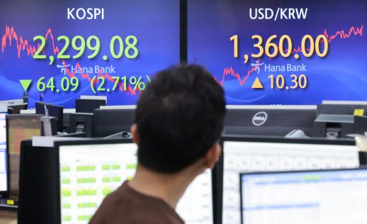 지난달 26일 오후 서울 중구 을지로 하나은행 본점 딜링룸 현황판에 코스피, 원·달러 환율 종가가 표시돼 있다. (사진=연합뉴스) |