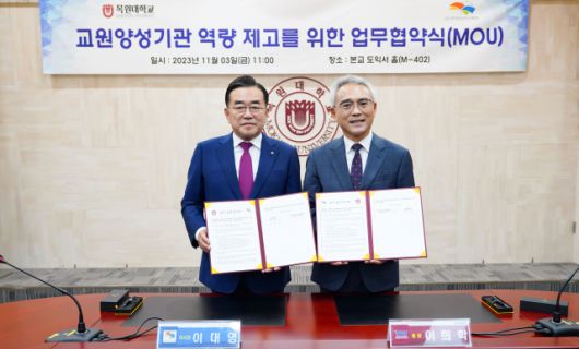 이대영 한국교과서협회 이사장과 이희학 목원대학교 총장이 3일 대전 서구 목원대학교에서 교원양성기관 역량 제고를 위한 업무협약식을 체결한 후 기념촬영을 하고 있다. 사진제공=한국교과서협회성형주 기자 foru82@sedaily.com[ⓒ 서울경제, 무단 전재 및 재배포 금지]