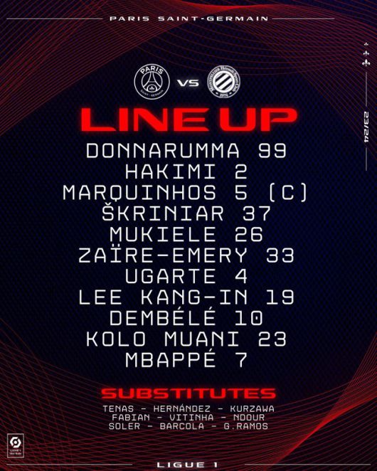 홈팀 PSG는 4-2-2-2 포메이션을 꺼냈다. 킬리안 음바페, 랑달 콜로 무아니가 최전방에 배치됐다. 2선에는 이강인, 우스만 뎀벨레가 호흡했다. 중원은 마누엘 우가르테, 워렌 자이르-에머리가 포진했다. 4백은 노르디 무키엘레, 밀란 슈크리니아르, 마르퀴뇨스, 아슈라프 하키미가 구성했다. 골문은 잔루이지 돈나룸마가 지켰다.